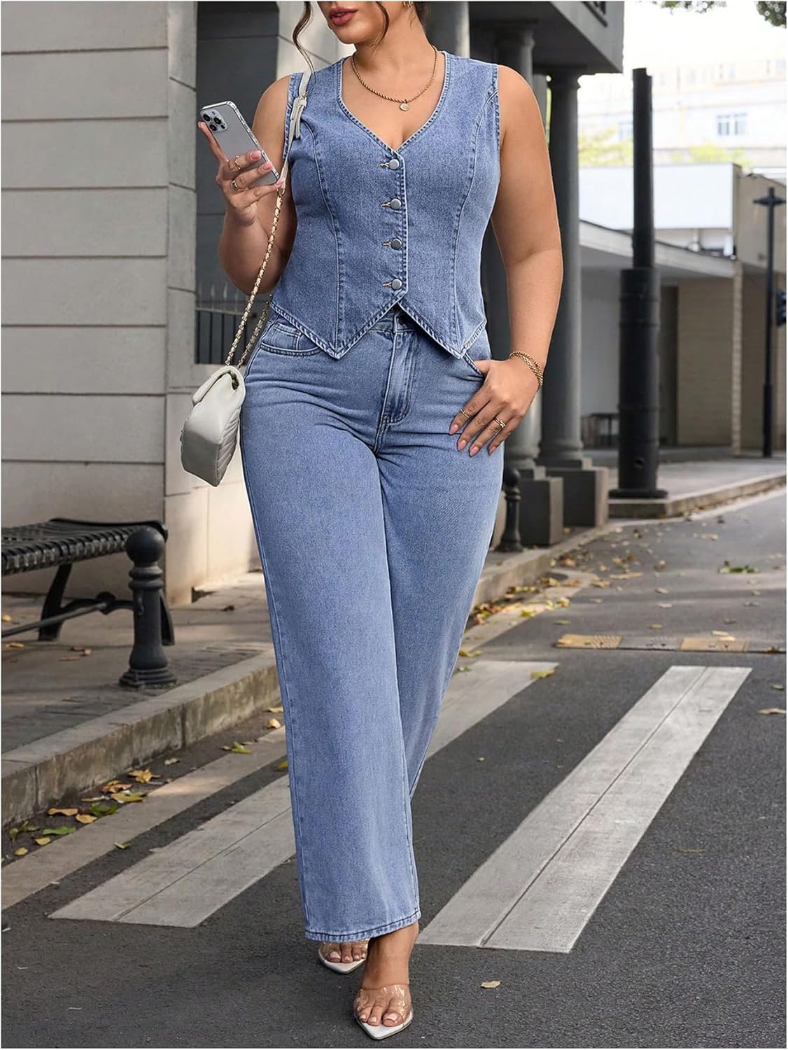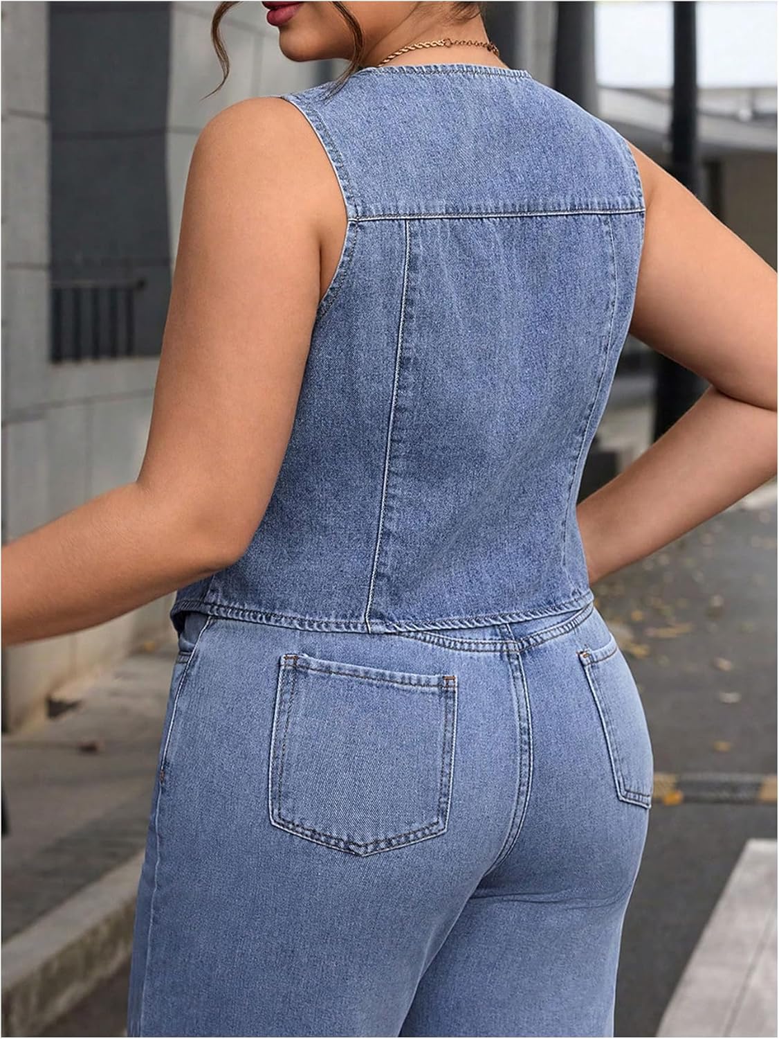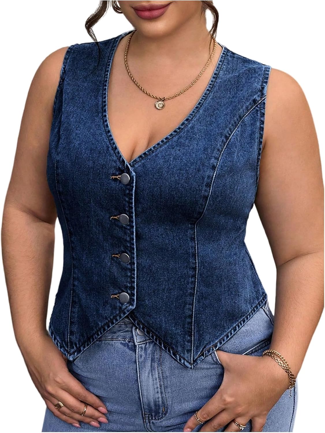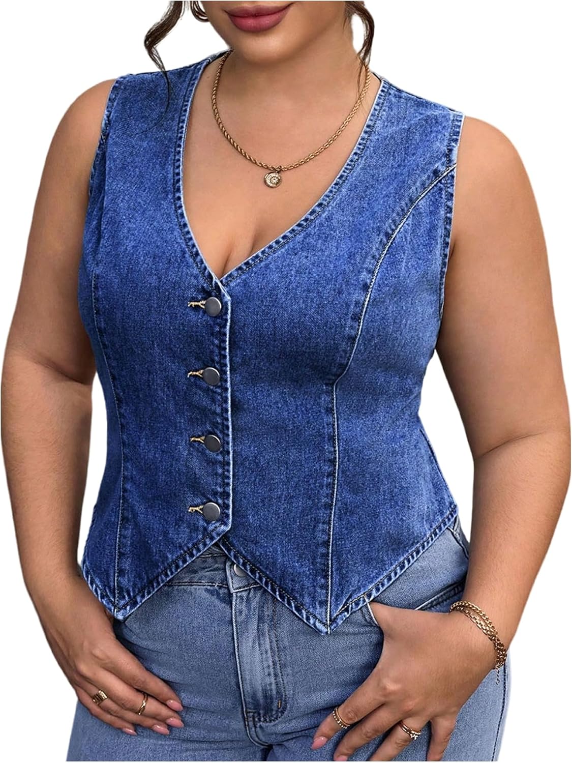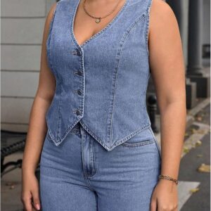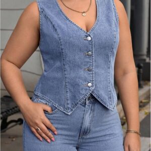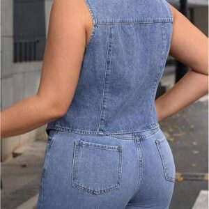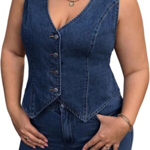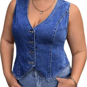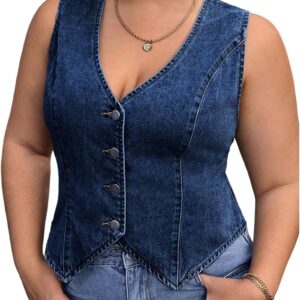 Floerns Women’s Plus Size Sleeveless Vest Denim Jacket Button Front V Neck Waistcoat