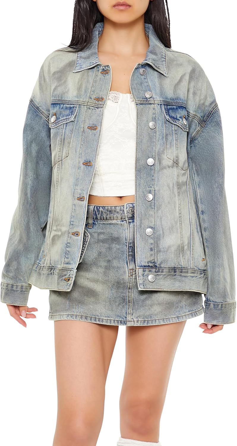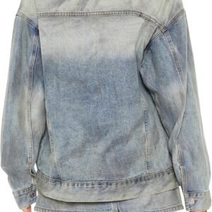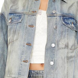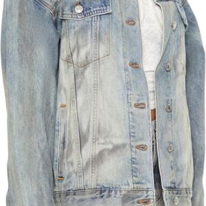 Crafted from non-stretch denim, this trucker jacket features an allover stone wash, basic collar, button-front closures, buttoned chest flap pockets and cuffs, slanted front pockets, and dropped long sleeves.