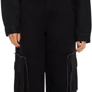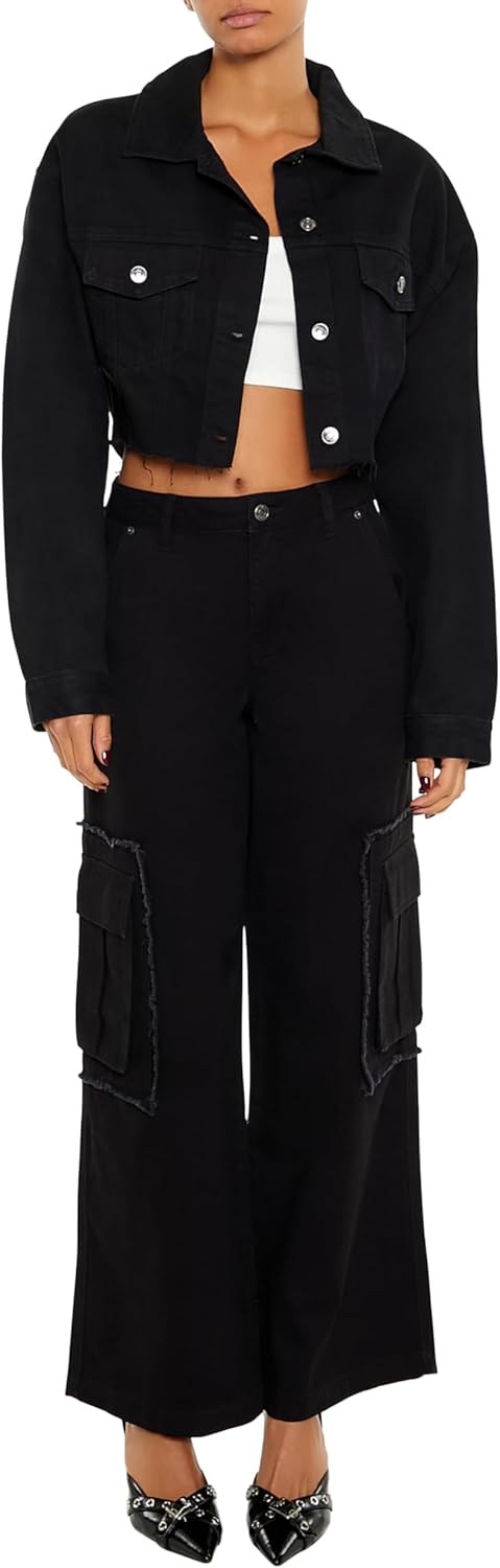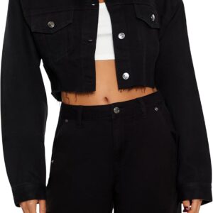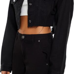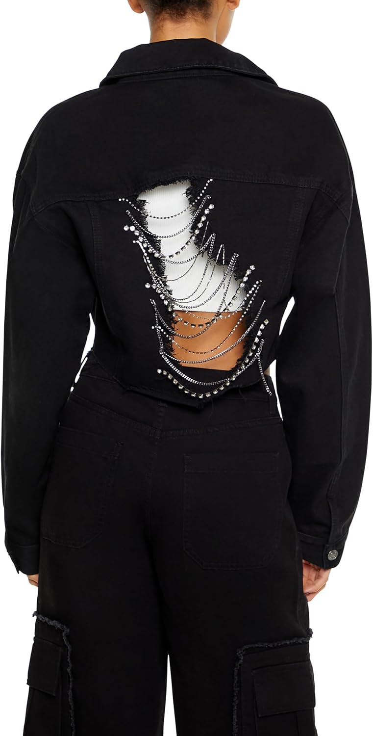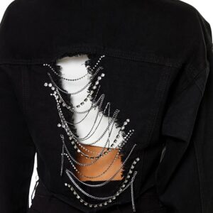Crafted from non-stretch denim, this trucker jacket features a basic collar, button-front closures, buttoned chest flap pockets and cuffs, dropped long sleeves, destroyed back cutout and ladder design with rhinestone box, faux gem, and curb chains, and raw-cut cropped hem.