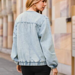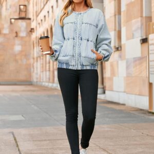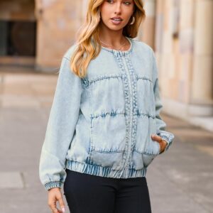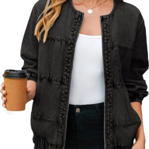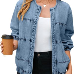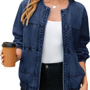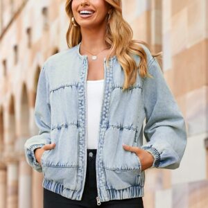 Glamaker Womens Denim Bomber Jacket Trendy Casual Zip Up Crew Neck Long Sleeve Loose Fit Jean Jacket Fall Outfits