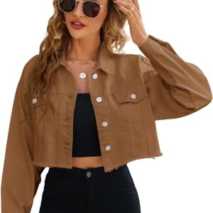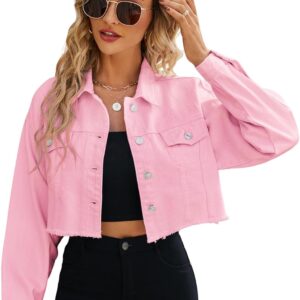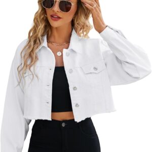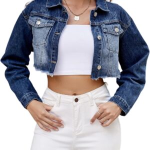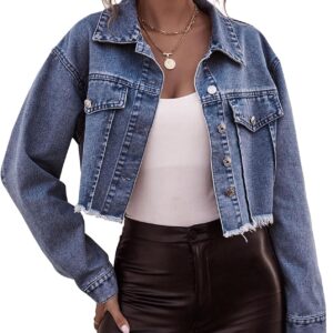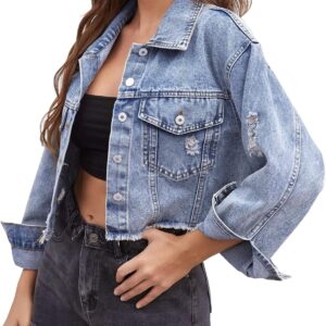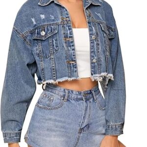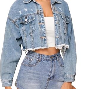 LONGYIDA Women’s Cropped Denim Jacket | Distressed Button-Down Jean Jacket | Long Sleeve Ripped & Frayed Blue Coat