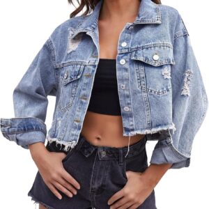 LONGYIDA Women’s Cropped Denim Jacket | Distressed Button-Down Jean Jacket | Long Sleeve Ripped & Frayed Blue Coat