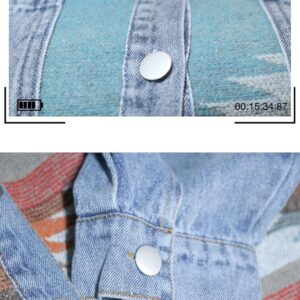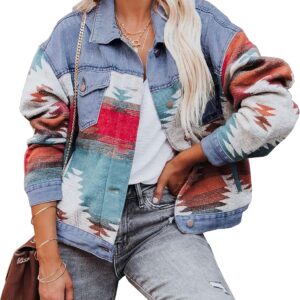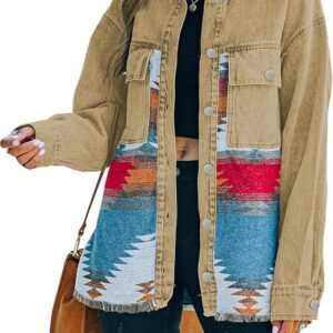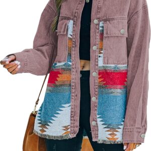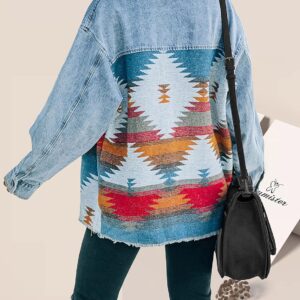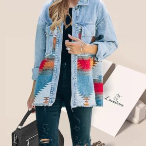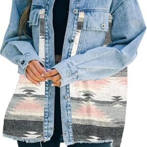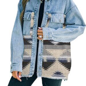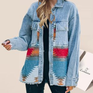 Lumister Women’s Aztec Denim Jacket Distressed Lapel Long Sleeve Vintage Button Down Denim Jacket Shacket