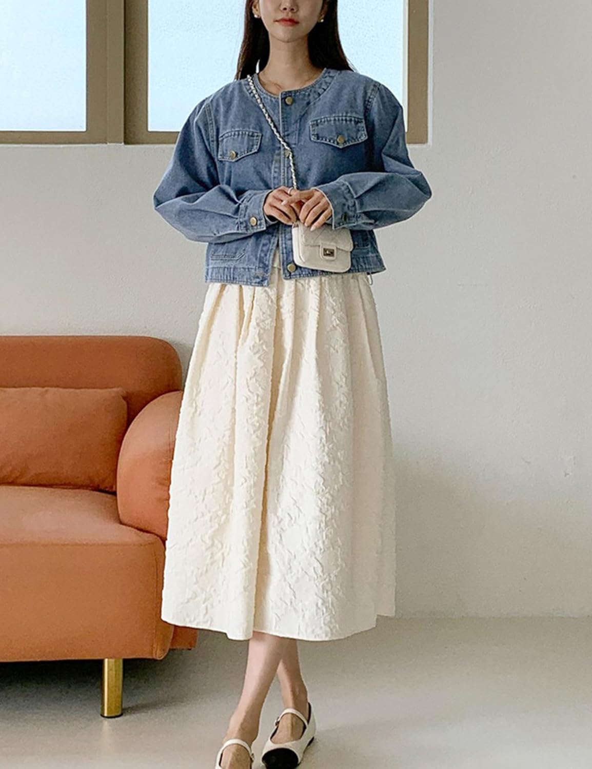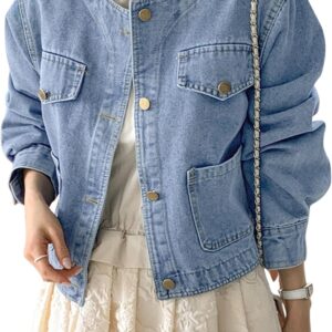 Omoone Women’s Denim Jacket Long Sleeve Crop Button Down Collarless Jean Coat with Pocket