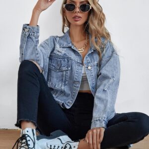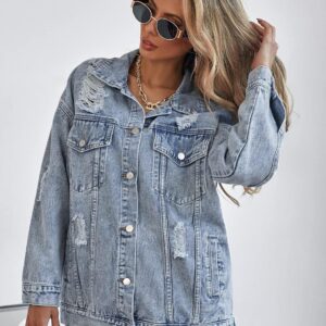 - Oversized Distressed Flap Pockets Denim Jacket, Ripped Long Sleeve Denim Coat.