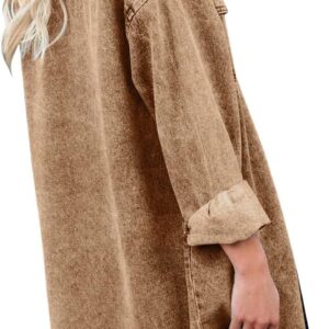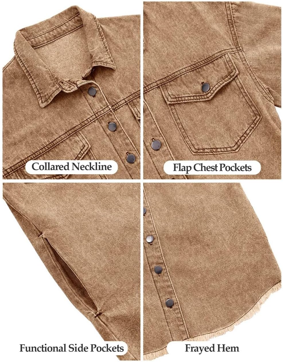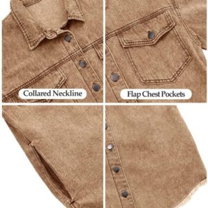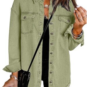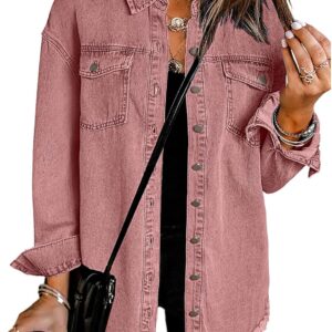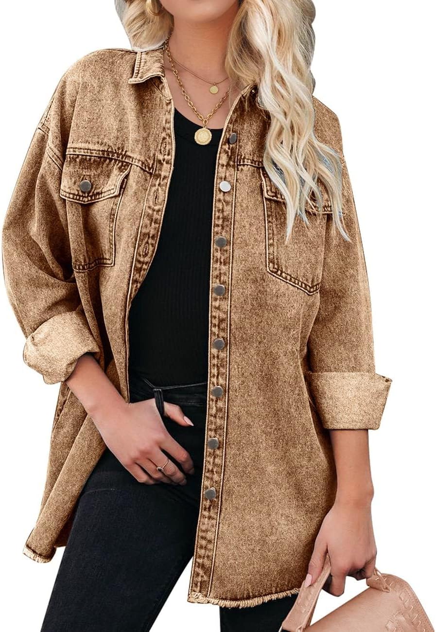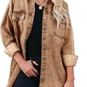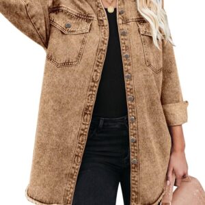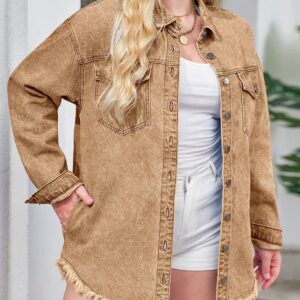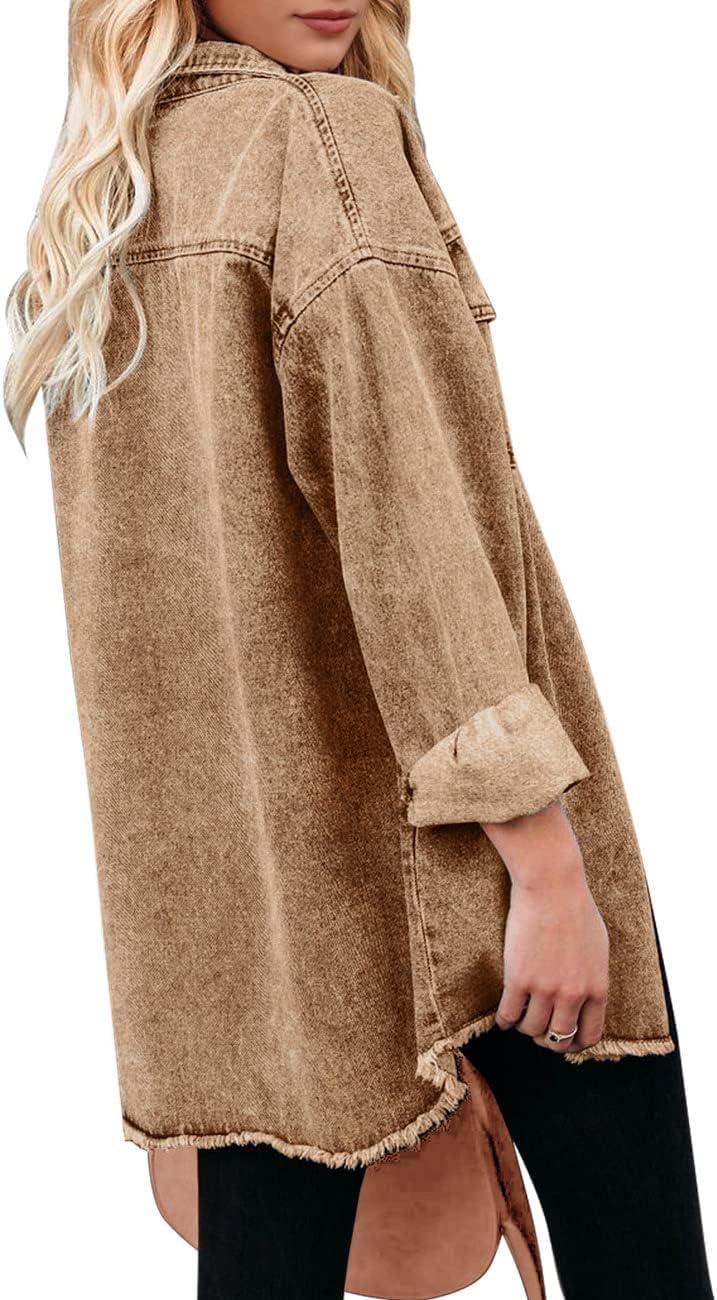 Vetinee Women\u2019s Oversized Button Up Frayed Hem Shacket Long Sleeve Pockets Denim Jean Jacket